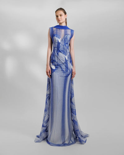 Description: This long dress has slim-cut that highlights your body. This dress is made to make you feel luxurious and elegant. This design is made of an embroidered pattern with a reversed collar design, an open back and tail.