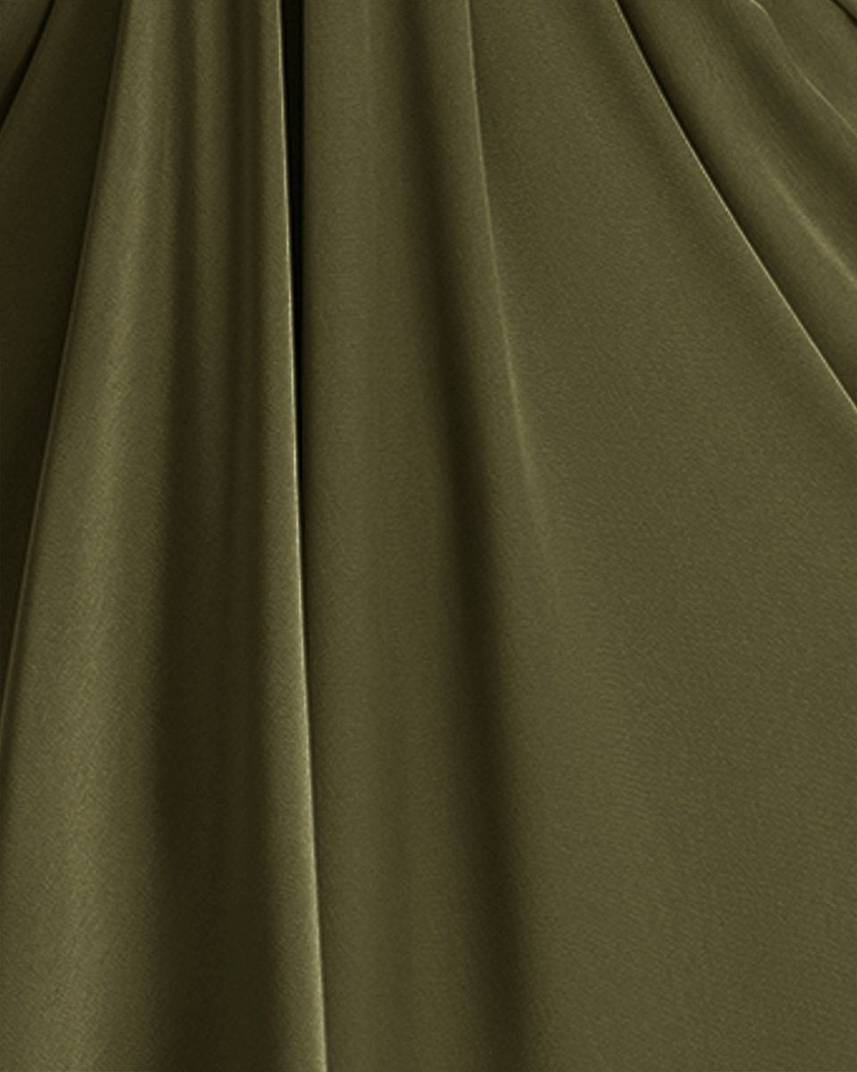 Description: V-neckline draped dress with ruffled cape-like sleeves and beadings at the front.
